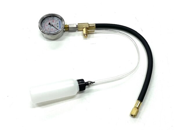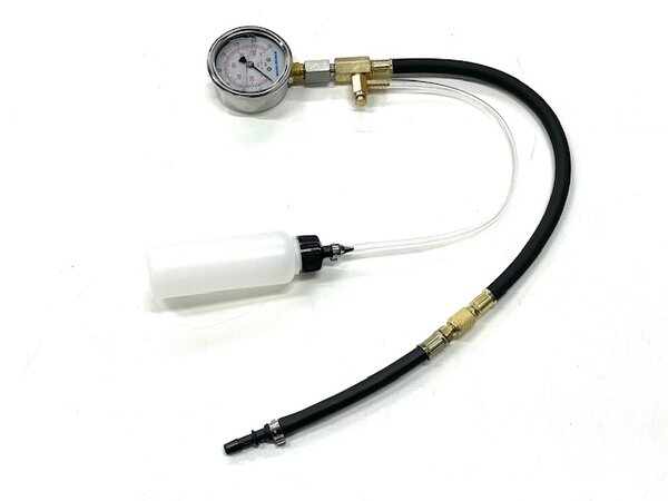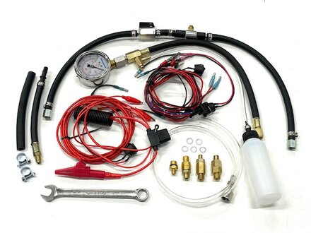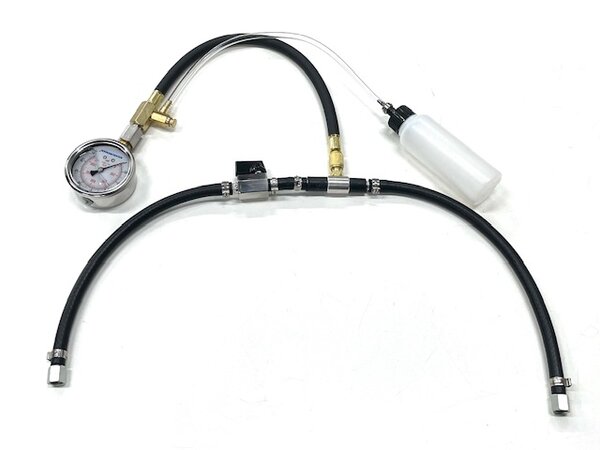 One pressure tester with a 160 psi gauge can complete all the tests, but it will need to be configured differently on some systems. In the T configuration shown below, you can pressure-test all Bosch CIS fuel injection systems, including K-Jetronic and KE-Jetronic. We pressure test the hoses and fittings for leaks, and the gauge for accuracy, before we ship it to you.