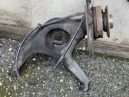 This is the last one we have available. Very good used straight rust-out free driver side trailing arm (there may be some small spots of surface rust.m Good shock absorber mounting threaded holes, good attachment studs. PLEASE NOTE: the outer hub bearing is making noise, so it should be replaced. So this will go into your 1977 to 1985 W123 without needing to change the emergency brake cable. If installed in a W115, W126, or early R107 you will need to use your existing cable.