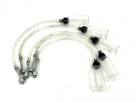 You attach these to your 200D, 220D, 240D, or 300D engine and turn the engine over with the starter motor for cleaning and testing. These can be used for various purposes. This is the best way to determine if the injection pump will perform properly for old 4- and 5-cylinder diesel engines that have not been run in years. It will also allow you to purge (clean out) old gummed-up injection pumps. And, finally, you can test for equal flow from the pump by measuring the quantities of fuel in each bottle. Watch the video below to understand what this kit can do and to ensure your injection pump is thoroughly cleaned and functioning on all five cylinders before starting the engine after long storage.