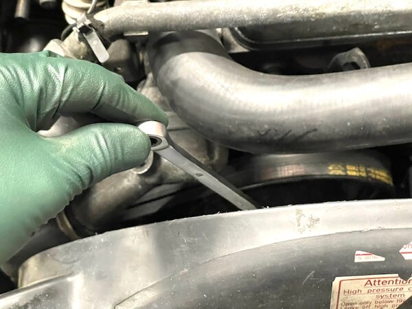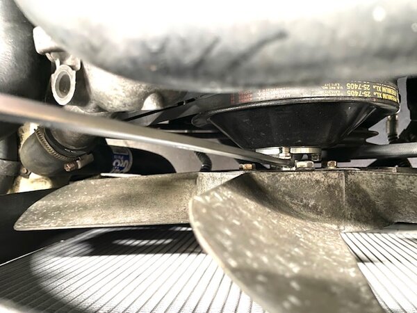 PLEASE NOTE: THE NEW WRENCH IS DIFFERENT FROM THE ONE PICTURED IN THE VIDEO ABOVE. What is particularly nice is having the extra torque of the long wrench. Most 10mm combination wrenches are really short, and if they are offset at all, they are very hard to get onto these bolts. If you have been as frustrated as I have with these bolts, then you will appreciate this solution. If changing a water pump or viscous fan is in your future, I highly recommend this tool. It will save a lot of frustration and some busted-up knuckles. The new wrench is long enough that it extends above the fan shroud.