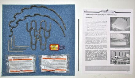 For ONE 116, 123 and 126 Chassis Sedans, Coupes or Wagon Seat Bottom. This unique kit is designed to help you repair and restore one broken down front seat bottom so common in the 116, 123 and 126 chassis Mercedes built from 1973 to 1991. And it can be done without taking the upholstery off the seat! (For 201 and 124 owners, this kit will work; however, the instructions will NOT apply. In most cases you would need to remove the upholstery to do the repair which is not how the kit was intended). The seat must be removed from the car and placed upside down on a work bench. You work with hand tools to install the included hardware from the underside of the seat frame. Average repair time is 2 hours for one seat. No special tools are required other than a grinder if you need to cut one or more of the reinforcement springs included. Included is a PDF 15 full page step by step instruction (with 50 pictures) on how to remove the seat, fix the broken springs, beef up weak areas, test the repair, and install the seat back in the car.